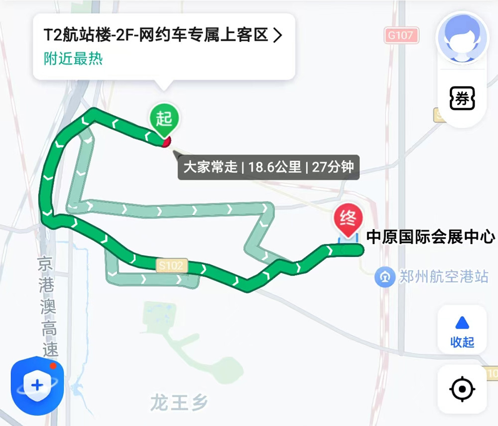 從新鄭機(jī)場出發(fā)→迎賓大道→華夏大道→金陵大道→濱河西路→亳都路→濱河?xùn)|路→會展五路→中原國際會展中心