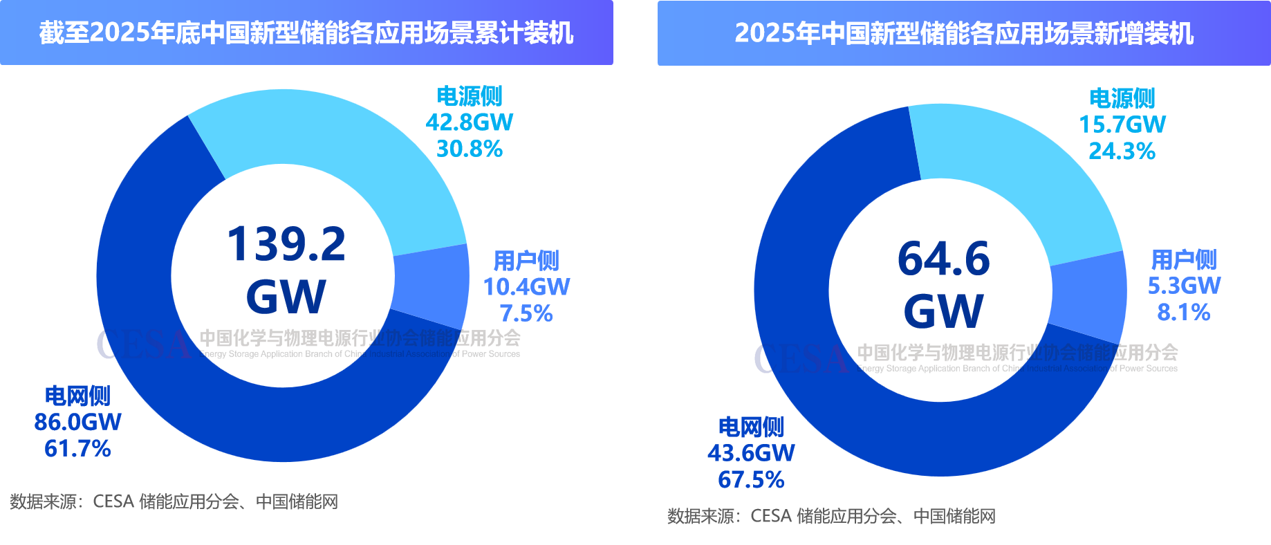CESA儲能應用分會數(shù)據(jù)顯示,2025年,電網(wǎng)側(cè)儲能新增裝機43.6GW/132.4GWh,占全國年度新增裝機總量的67.5%(功率)/67.4%(容量),同比增長65.6%(功率)/104.2%(容量)。