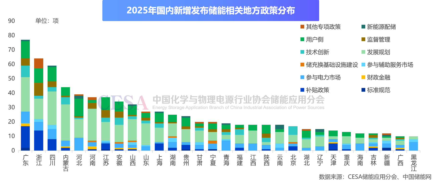 CESA儲能應用分會數(shù)據(jù)顯示,2025年,國內(nèi)共新出臺了804項儲能直接或間接相關(guān)地方政策,其中廣東領(lǐng)跑全國,新增77項,數(shù)量占比9.6%;浙江新增64項,全國第二。四川新增59項,位列第三。內(nèi)蒙古、河北、河南、江蘇、安徽、山西新增均超過30項。